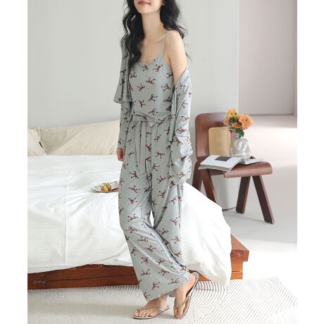 柔らかく伸縮性のある生地で仕立てた、キャミソール・ロングパンツ・カーディガンの3点セットパジャマ。取り外し可能なカップ付きキャミソールで、ブラジャーなしでも安心して着用できるデザインです。