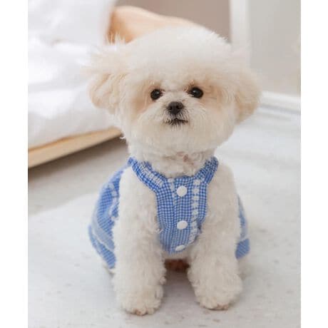キャミソールワンピースのようなデザインのペットウェアです。フリルと、ギンガムチェックに花柄のレースがついていてかわいい!前開きのスナップボタンで、肩部分にはゴム紐が入っているので着用も楽々!お腹部分はカバーされないのでトイレも心配ありません。お散歩やお出かけの楽しみが増えます!