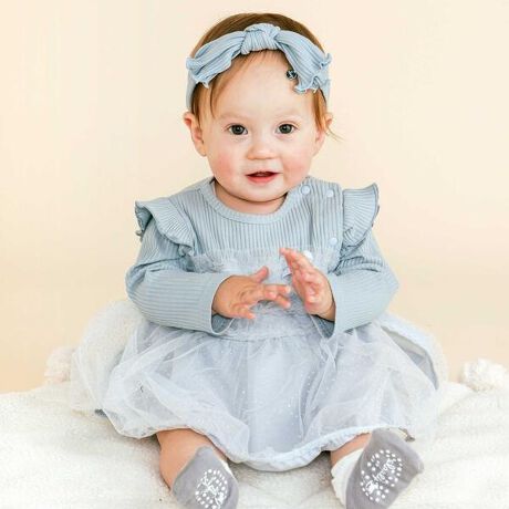 キラキラでふわふわ、とってもフェミニンなデザインが女の子らしい長袖ロンパース。