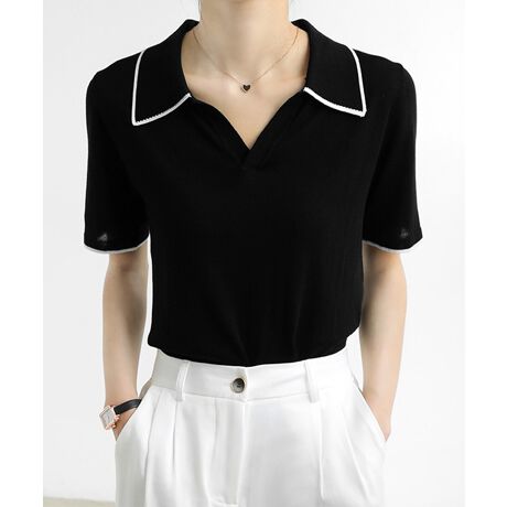 ポロデザインが上品な印象を与える半袖ニットトップス