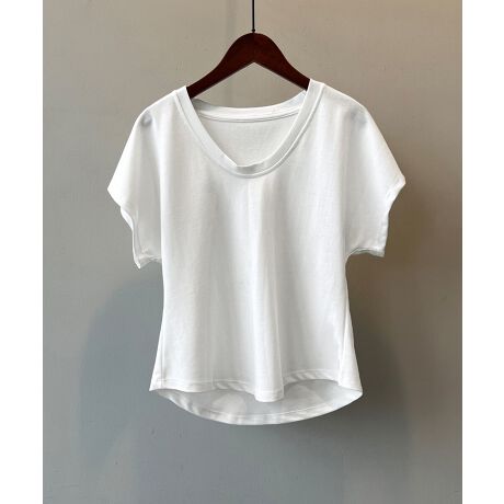 深めのUネックラインが女性らしい印象を与えるベーシックなカットソー。