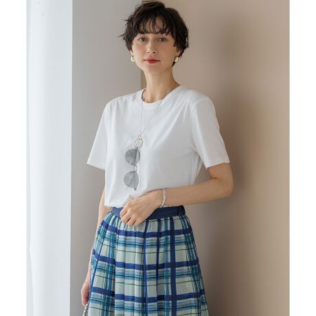 シンプルながらも洗練されたベーシックTシャツです。開きすぎない上品な首元がポイントで、一枚で着てもインナーとしてもサマになります。どんなボトムにも合わせやすい丈感とシルエットで、カジュアルなデニムスタイルから、きれいめなスカートやパンツスタイルまで、幅広いコーディネートに対応します。デイリーユースに欠かせない、着回し力抜群のアイテムです。上品な素材感とベーシックなデザインで、長くご愛用いただけます。カラーは、清潔感のあるホワイト(#001)、ニュアンス感のあるグレー(#004)、印象引き締まるブラック(#005)、明るい印象のピンク(#012)、ヘルシーな雰囲気のオレンジ(#020)、フェミニンさをプラスするブラウン(#030)、やわらかな印象のベージュ(#033)、顔回りを明るく見せるイエロー(#040)、爽やかなサックスブルー(#073)、洒落感のあるダルブルー(#074)の10色展開です。