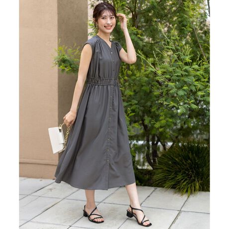 ・ウエストのギャザーデザインがポイントのワンピース・すっきりとしたネックラインと、きらりと光るボタンが上品な印象・ウエストのギャザーはゴム仕様で、楽な着用感