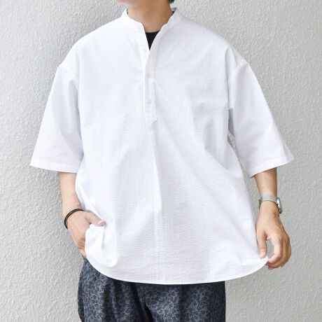 夏に最適なシアサッカー素材のバンドカラープルオーバー型シャツが登場!