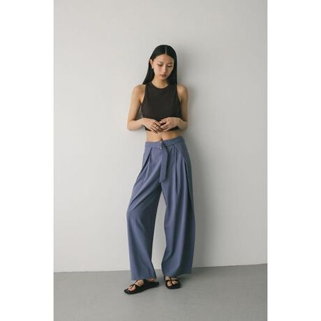 モデル身長172cm(Mサイズ着用)両サイドがラップデザインになっているシルエットがポイントのパンツ。フロントのバックルデザインで、トップスをインした時もスタイリングのアクセントになる一枚です。ストンと落ちるボトムスラインとワイドシルエットが脚のラインを拾わずスタイルアップ見せしてくれます。ローウエスト設定で腰回りをすっきりとした印象に導きます。ストレッチあり、透け感なし。【お手入れ方法】マシンウォッシュ可
