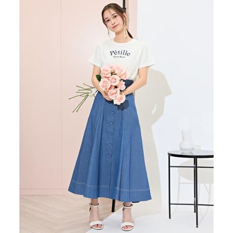 ボリューム感のあるフレアシルエットがレディな雰囲気を引き立てるデニムスカート【Design】・フロントはフェイクボタン仕様で、きちんと感とトレンド感を両立。・薄手ながらハリのあるデニム生地を使用し、美しいフレアラインをキープします♪・ステッチ使いがエッジを効かせ、コーディネートにさりげない動きをプラス。・後ろファスナー&ウエストはゴム+レースアップ仕様で、自分好みのフィット感に調整可能◎・ウエスト切り替えのないすっきりデザインで、着ぶくれせずスマートに見せます。・デイリーからお出かけまで、幅広いシーンで活躍する万能アイテムです!【Fabric】・夏にも着回ししやすい薄めのデニム生地を使用。・ハリ感のあるさらりとした裏地付き。・ブルー、インディゴの2色展開となります。【Care】ドライクリーニング