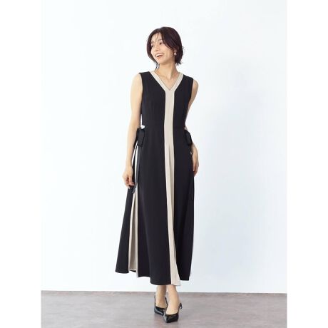 バイカラーラインの縦長効果でスタイルアップが叶うノースリーブワンピース。
