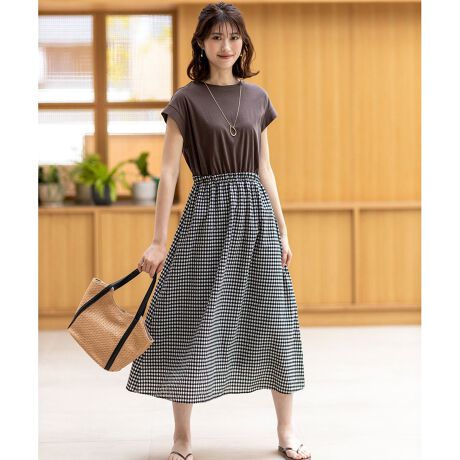 ・美シルエットを実現したドッキングワンピース・さらっとかぶれて着脱も楽ちんな一着・カットソー素材で猛暑でもTシャツ感覚で着こなせる・二の腕をカバーできる長めのフレンチスリーブ・華やかなビッグチェックと、コーデに取り入れやすいモノトーンチェックの2柄展開