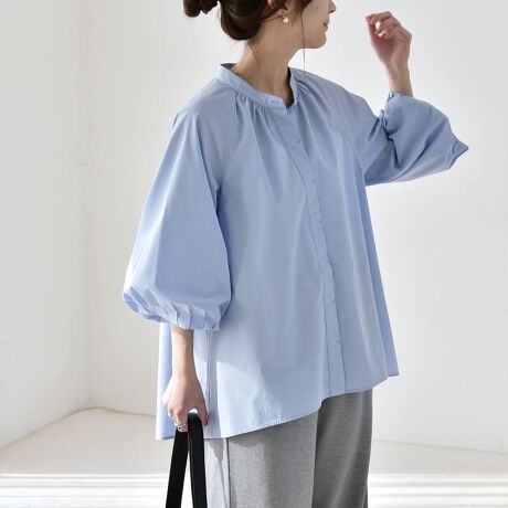 たっぷりとしたボリュームスリーブが可愛いバンドカラーシャツ。