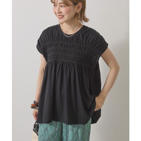 シャーリングデザインがさりげない洒落感を演出するプルオーバー。なだらかに落ちるフレンチ袖に、裾に向かってふんわり広がるフレアシルエットが女性らしいひと品です。ストレッチ性のあるカットソーにハリのあるコットン生地を前後で異素材ドッキング。シンプルなワントーンカラーで幅広いボトムに合わせやすいおすすめのトップスです。透け感[ややあり]