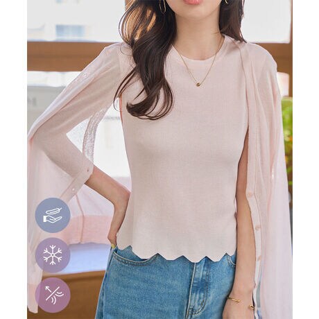同じ糸でお仕立てした【N1189】接触冷感ベーシックシアーニットカーディガンとアンサンブル着用が可能です。