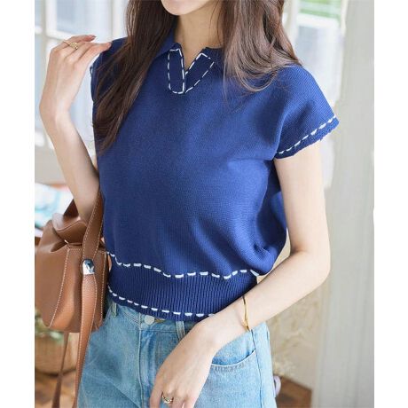 手書き風の配色ステッチが存在感を引き立て、襟元はスキッパーデザインでラフな抜け感を演出。