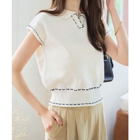 レディに着れるクラシカルな襟付きポロニットトップス。