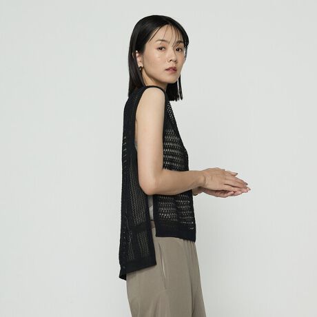脇を後ろ身頃から編み続きの総針ベルトで繋いでいるので、見た目も軽やかでインするアイテを選びません。