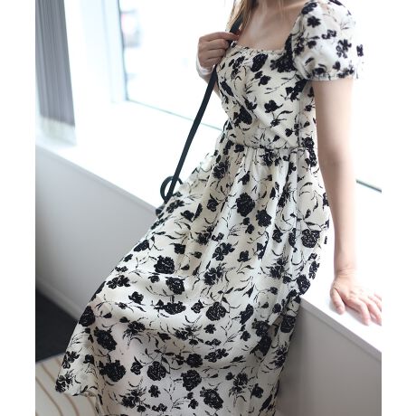 ビンテージの図案から起こした花柄をオパール加工したベルベットワンピース綺麗に鎖骨を見せるスクエアネックが嬉しいポイントハイウエストデザインと後ろ身頃に施したシャーリングでメリハリボディに。結婚式のドレスにもおすすめです。