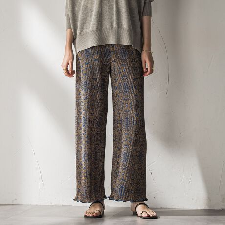 シックな配色のオリエンタルなプリントが目を惹く、プリーツパンツ。