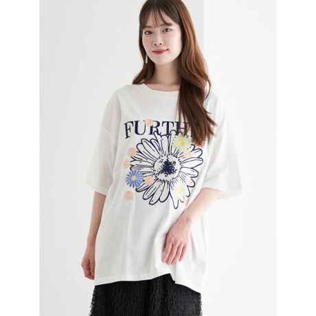 カラフルなフラワー刺繍を散りばめた着映えTシャツ。