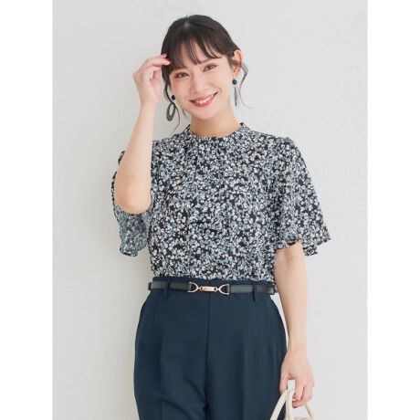 モノトーンの花柄で大人顔を演出するボウタイブラウス