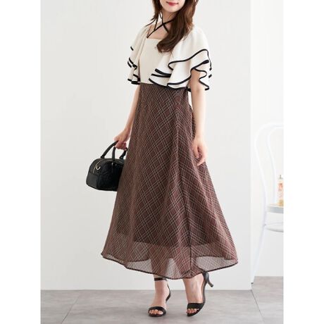 ・袖フリルブラウスとチェック柄スカートをドッキングした着るだけで即お洒落見えが叶う1枚。