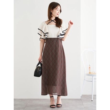 ・袖フリルブラウスとチェック柄スカートをドッキングした着るだけで即お洒落見えが叶う1枚。