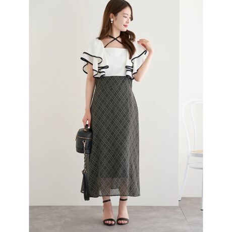 ・袖フリルブラウスとチェック柄スカートをドッキングした着るだけで即お洒落見えが叶う1枚。