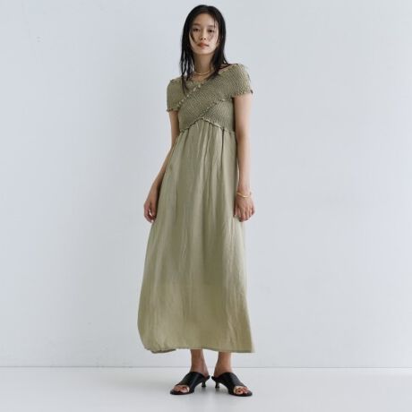 シャーリングディテールが施された、女性らしさとヘルシーさを感じさせるワンピース。