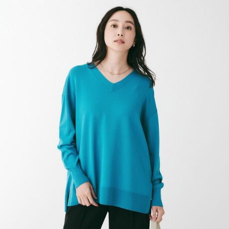 パンツ合わせにおすすめなヒップをカバーする着丈とVネックでスッキリ見えのニット。