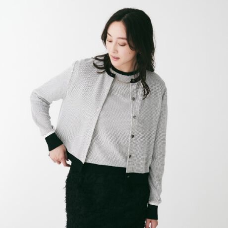 2色使いの細かな凹凸の地柄編地に、衿・裾・袖口を配色アクセント使いしたカーデです。