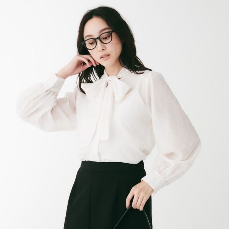 顔まわりが華やかに見えるボウタイの太さにこだわったブラウス。