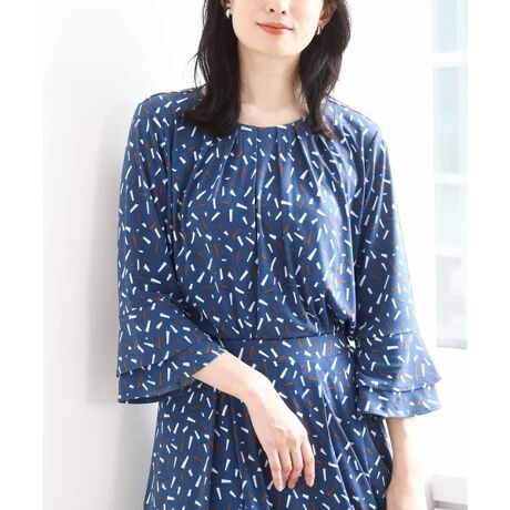 紙吹雪を散らしたような動きのある柄がきちんと見えの中にも華やかさのあるプリントブラウス。衿ぐりのタックと袖口の重ねたフレアーデザインが女性らしく着こなせます。