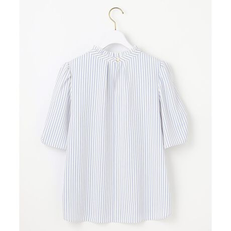 ・首元を上品に見せるフリルネックのスタンドカラーブラウス・程よいフリルで可愛くなり過ぎない大人な仕上がり・袖にはタックデザインで着映えるポイント・裾がラウンドしているのでインでもアウトでも決まります・オフとネイビーはオケージョンシーンにも活躍