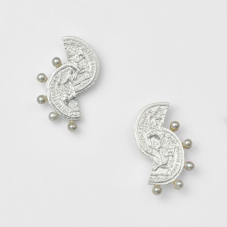 アンティークコインモチーフをセンターでスライドさせた、ユニークなデザインのピアスです。ハードな印象のコインモチーフに、淡水パールを組み合わせることで、柔らかさと上品さをプラスしています。グレーカラーのパールを使用することで、シルバーとのワントーン感が高まり、より洗練された印象に。このピアスひとつで、カジュアルダウンされたスタイリングが完成します。使い続けるうちにシルバーの風合いが変化し、パールとのコントラストが深まっていくのも魅力のひとつです。日常使いにも取り入れやすい、個性と上品さを兼ね備えたアイテムです。<価格改定のお知らせ> 2026年2月4日(水)より、素材の価格高騰に伴い価格改定を行います。商品タグに記載している価格につきまして、旧価格のものが混在している場合がございます。ご了承くださいますようお願い申し上げます。※天然石や天然素材を使用しているものは、サイズ・色味・風合いの違いや、若干の傷、内包物の有無などに個体差があります。予めご了承ください。※パールは、のり留め(芯立て)ですので水分にはご注意下さい。