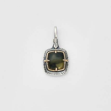 ブルーアンバーとマリアージュリファインドジェットを重ねたネックレスチャーム。下に重ねたジェットが、ブルーアンバーの色味を引き立ててくれます。ブルーアンバーは、太陽光などに含まれる紫外線に反応し、神秘的な青い偏光色を発する希少性の高いアンバーです。地の色は明るいコニャックカラーですが、光によってグリーンっぽく見えたり、ふわっと青が浮かび上がったりと、常に移り変わる空模様のような表情を見せます。使うほどに味が出る、ヴィンテージ感のあるデザインに仕上げています。※天然石や天然素材を使用しているものは、サイズ・色味・風合いの違いや、若干の傷、内包物の有無などに個体差があります。予めご了承ください。