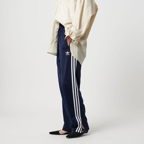 <adidas>の象徴であるスリーストライプスを脚の両サイドに、トレフォイルロゴ刺繍が片方のサイドにあしらわれています。