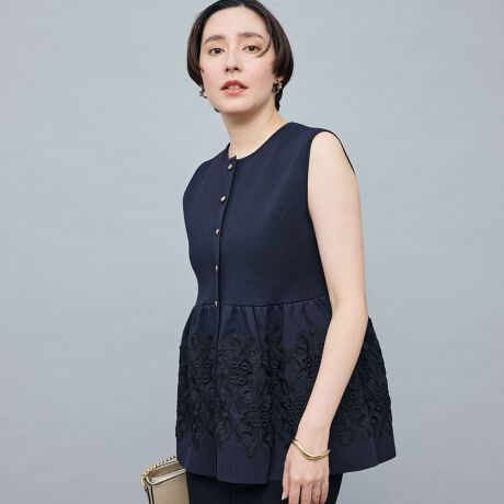 ・裾に施した繊細なカーブを描くレースモチーフがポイントのペプラムベスト