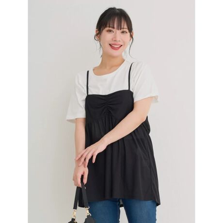 胸元のギャザーがフェミニンなキャミソール×Tシャツの2点セット。