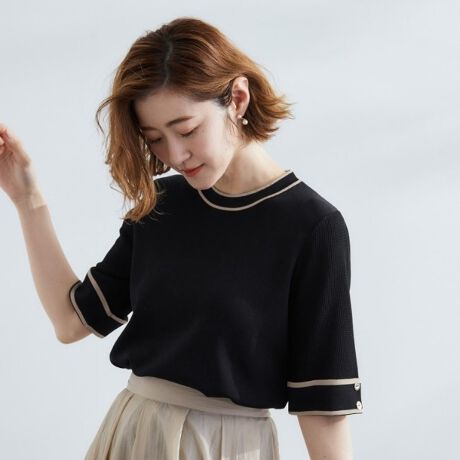 二の腕がしっかり隠れる五分袖丈で、初夏〜秋口までロングシーズン活躍します。