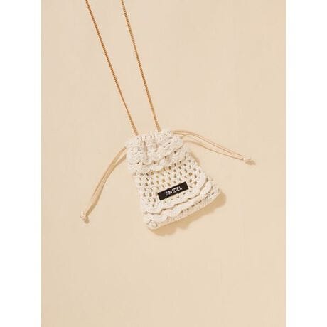 リップやなどが収納できる手のひらサイズのマイクロミニポーチに、リュクスなゴールドショルダーチェーンストラップをあしらったフリルミニショルダーです。ポーチはカジュアルな巾着タイプ。いつものスタイリングにアクセサリー感覚で取り入れれば、秋冬コーデに華やぎをプラスします。カラーにより異なる素材でお作りしました。アイボリーとブラックとブラウンはフロントが透け感のあるクロシェ編みニットです。背面には透け感のないナイロン生地をドッキング。ドットはアイボリーにクラシカルなブラックのドット柄の透け感のあるチュール素材をフリルにしてあしらいました。背面には透け感のないナイロン生地をドッキングしています。フロントのSNIDELロゴのテープがアクセントに。プレゼントにも最適です。