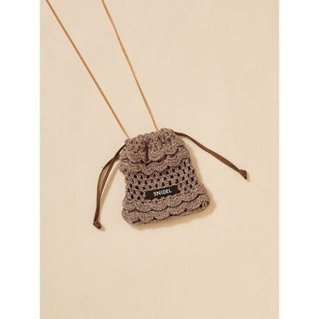 リップやなどが収納できる手のひらサイズのマイクロミニポーチに、リュクスなゴールドショルダーチェーンストラップをあしらったフリルミニショルダーです。ポーチはカジュアルな巾着タイプ。いつものスタイリングにアクセサリー感覚で取り入れれば、秋冬コーデに華やぎをプラスします。カラーにより異なる素材でお作りしました。アイボリーとブラックとブラウンはフロントが透け感のあるクロシェ編みニットです。背面には透け感のないナイロン生地をドッキング。ドットはアイボリーにクラシカルなブラックのドット柄の透け感のあるチュール素材をフリルにしてあしらいました。背面には透け感のないナイロン生地をドッキングしています。フロントのSNIDELロゴのテープがアクセントに。プレゼントにも最適です。