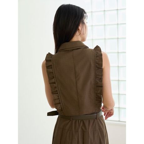 今季らしさを叶える丈感が魅力のノースリクロップドフリルシャツは、フロントに細めのフリルとピンタックをたっぷりと重ねることで愛らしく、ヴィンテージライクに仕上げました。バックスタイルはすっきりとスタイルよく見えるよう、フリルをやや斜めに入れました。フロントのボタンは比翼仕立てですっきりと。襟は女性らしい丸味のあるシルエットに加えて、重ね襟デザインでトレンドライクに。程よいクロップド丈でスタイルアップを叶えてくれます。キレイめミニスカートに合わせたり、カジュアルなワイドパンツに合わせたり、今季らしいバランスで着こなせるアイテムです。