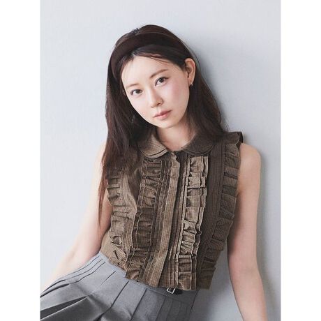 今季らしさを叶える丈感が魅力のノースリクロップドフリルシャツは、フロントに細めのフリルとピンタックをたっぷりと重ねることで愛らしく、ヴィンテージライクに仕上げました。バックスタイルはすっきりとスタイルよく見えるよう、フリルをやや斜めに入れました。フロントのボタンは比翼仕立てですっきりと。襟は女性らしい丸味のあるシルエットに加えて、重ね襟デザインでトレンドライクに。程よいクロップド丈でスタイルアップを叶えてくれます。キレイめミニスカートに合わせたり、カジュアルなワイドパンツに合わせたり、今季らしいバランスで着こなせるアイテムです。