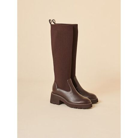 フェイクレザーと、ハリ感・伸縮性のあるリブニット素材の異素材コンビでお作りしたトレンド感のあるロングニットブーツがお目見え。リブニット素材はフィット感があり、足首の華奢見え効果も。ヒール6cm、ストーム2.2cmのプラットフォームで、スタイルアップと歩きやすさを実現。ミニスカートにも合わせやすいロング丈で、バランスよくご着用いただけます。伸縮性のあるニット素材で着脱もスムーズです。かかとにSNIDELロゴのエンブレムを型押ししてさり気ないアクセントに。ブラック、ダークブラウンの2色展開です。ショート丈(SWGS254625)もご用意がございます。