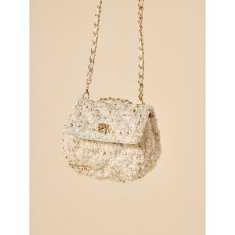 手のひらサイズのころんとしたフォルムがキレイめからカジュアルまで、様々なスタイリングにアクセントを添えるキルティングチェーンミニバッグです。クラシカルなキルティング生地に、SNIDELゴールドロゴプレートを添えました。ストラップはチェーンで高級感のあるデザインです。ブラック、アイボリー、パープルの3色展開ですが、カラーにより異なる素材感で雰囲気を変えてお作りしています。ブラックはスムースレザー調、アイボリーはゴールドリボンを利かせたツイード、スモーキーカラーが大人な印象のパープルはラメをのせた生地でキラキラとしています。小ぶりながらもマチがあり、ミニ財布やイヤホン、鍵などの必需品を入れておけます。肩掛けができるチェーンストラップと、手持ちできるチェーンハンドルも付いており、肩掛けができるストラップは取り外しが可能。バッグはフラップ部分のマグネットでしっかりと留められます。外側にファスナー付きのカード類などが入れられるポケットが1つ付いています。