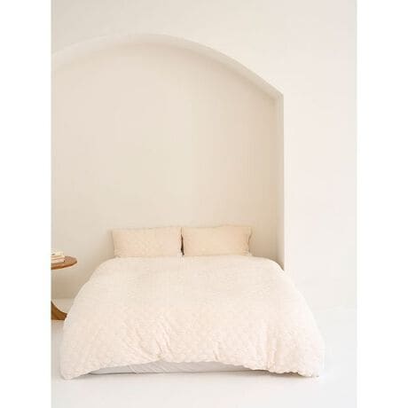 くしゅっとギャザーが入った、ふくれジャガードの寝具シリーズ。ぽこぽことした表面感がキュートな、ダブルサイズの寝具3点セットです。ピローケースと掛けカバーはふくれジャガード、ボックスシーツのみフラットな生地を使用しました。いずれも柔らかなカットソー素材なので、肌触りが優しく季節を問わずご使用いただけるのも魅力。シンプルなデザインで、幅広いインテリアになじみます。色はオフホワイトとブルーの2色展開。ギフトにもおすすめのアイテムです。