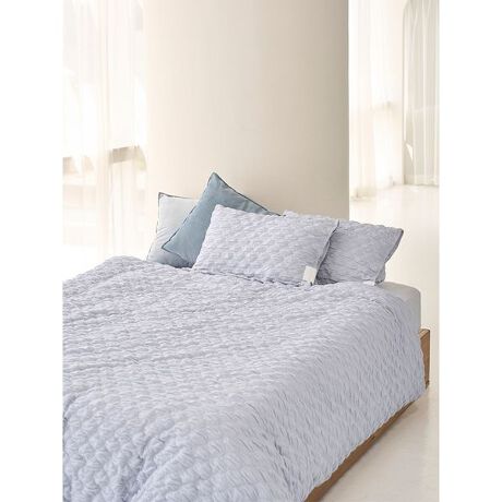 くしゅっとギャザーが入った、ふくれジャガードの寝具シリーズ。ぽこぽことした表面感がキュートな、ダブルサイズの寝具3点セットです。ピローケースと掛けカバーはふくれジャガード、ボックスシーツのみフラットな生地を使用しました。いずれも柔らかなカットソー素材なので、肌触りが優しく季節を問わずご使用いただけるのも魅力。シンプルなデザインで、幅広いインテリアになじみます。色はオフホワイトとブルーの2色展開。ギフトにもおすすめのアイテムです。