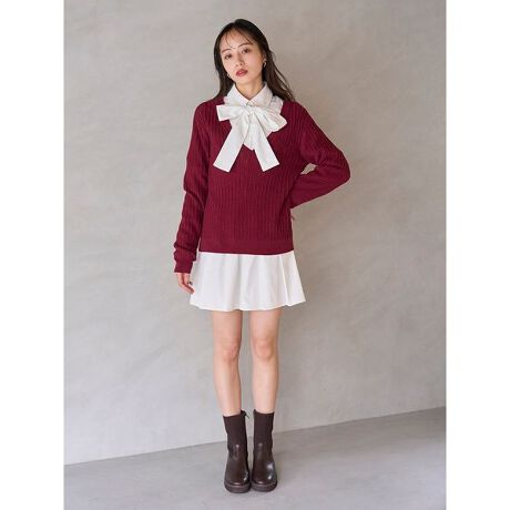 <b>【ボウタイリボンシャツチュニックとレース編みニットがセットになったプレッピールックアイテム】</b>