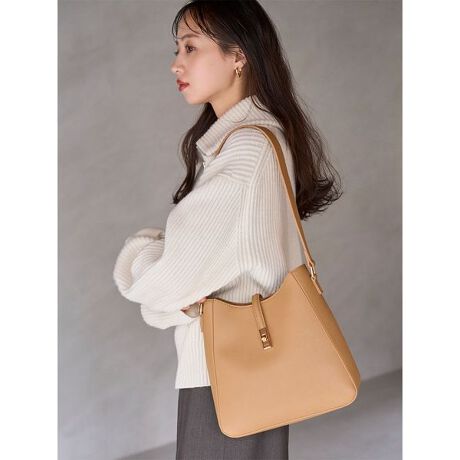 程よく柔らかなフェイクレザー素材を使用した、洗練された雰囲気が魅力のツイストメタルトートバッグです。ツイストでオープンできる品のあるゴールド金具が高級感を演出。安定感のある程よく幅広のストラップで、ショルダーの長さは調節が可能です。お財布やタンブラー、ポーチやiPadなどがたっぷり入る収納力も魅力。内側にはポケットが両サイドにポケットが付いていて便利です。ブラック、キャメル、ピンクの3色展開です。ピンクはグレー調のスモーキーな色味で大人な印象です。