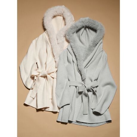<b>【たっぷりフードとフェイクファーが華やかなキレイめニットコート】</b>