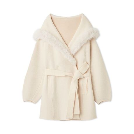 <b>【たっぷりフードとフェイクファーが華やかなキレイめニットコート】</b>