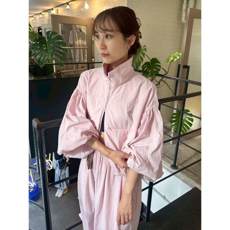 スタンドカラーとステンカラーの2wayで着用可能な首まわりや脇下や袖下に施されたタック、裾のゴム&ギャザーの仕様で程よいボリューム感のあるシルエットが印象的です。衿部分にemmiロゴのシリコンプリント入り。